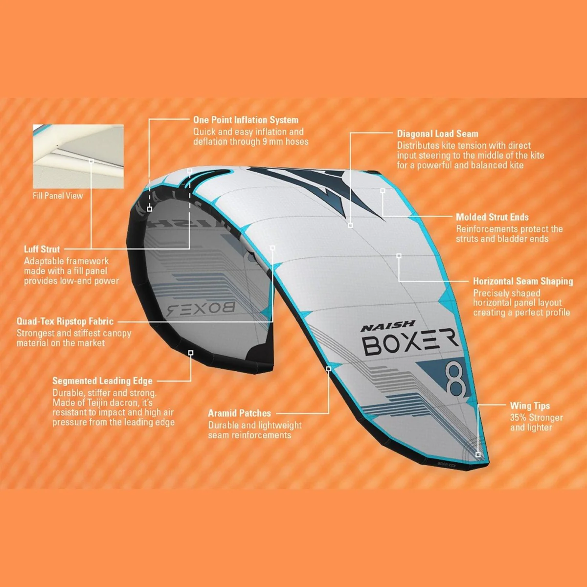 The Boxer is our premier one-strut kite constructed to be lightweight, ultra-durable, and responsive. This year, the smaller sizes have increased turning speed and are mainly focused on foiling. These kites now sit deeper in the window, giving you a more solid feel while foiling. The panel count is also optimized by size, meaning all kites in the range have a similar feel due to the larger sizes having more panels, and the smaller sizes having fewer, bringing the ultimate balance of structure and weight per size. The Dacron layout has also been redesigned to keep weight down. Along with our new lightweight/streamlined TLS 500 bridle lines, the Boxer now flies better than ever in light air. The huge size range from 2.8-16 m means the Boxer has the largest range in the Naish lineup, with the bigger sizes being great light wind twin tip options, the middle sizes being great for all-around light wind riding (surfboard, foil, twin tip) and the smaller sizes excelling at kite foiling. A point which may be overlooked by most riders, the Boxer shines at light wind and down-the-line wave riding, drifting better than almost anything due to its light weight single luff strut design. If you are looking for the perfect kite to enjoy regular/marginal winds, or take your foiling to the next level, enjoy the most efficient kite in the lineup, the Boxer.
