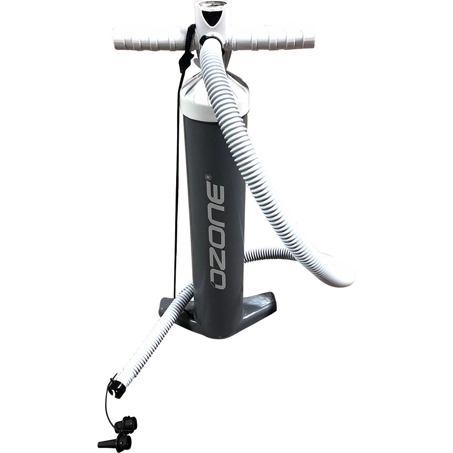Dual action kite pump from Ozone with integrated PSI meter in the handle. Pump your kite or wing to perfection. Comes with hose adapters for the Ozone Boston inflate/deflate and standard 9mm valves. 2.9L capacity