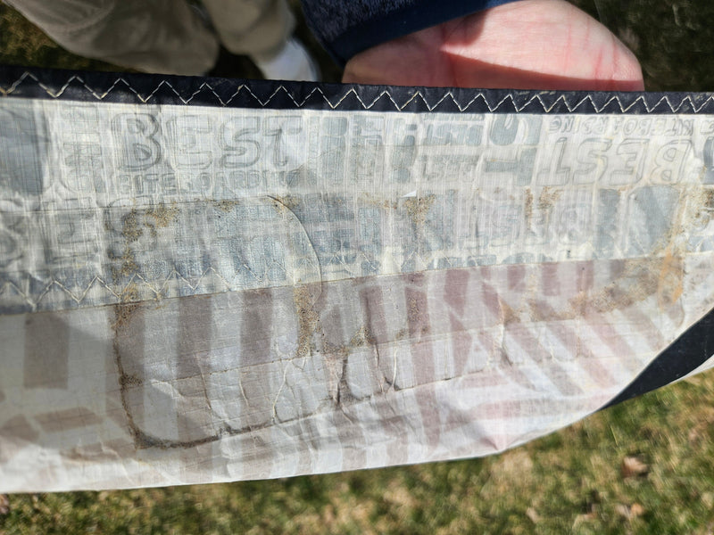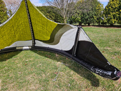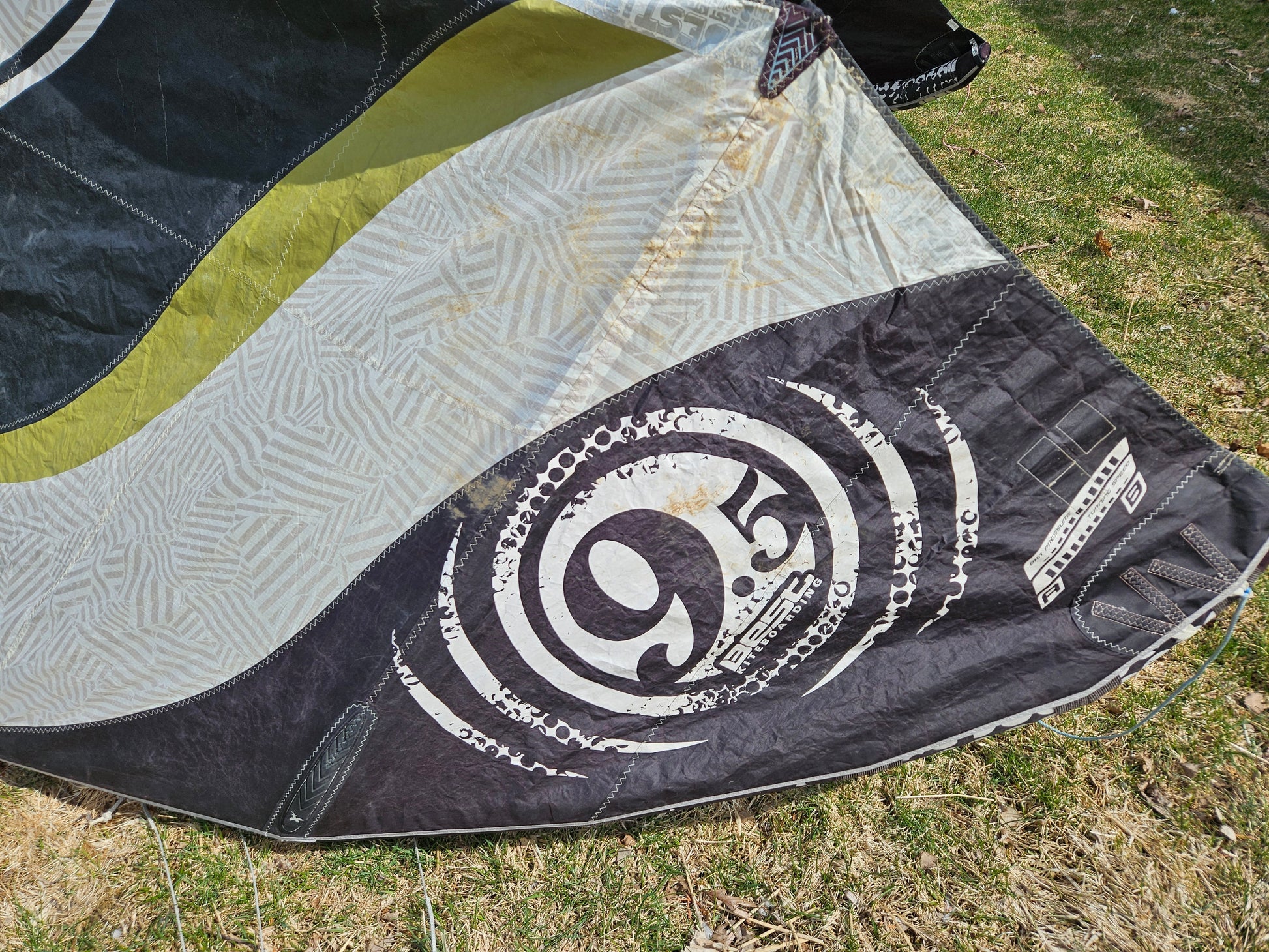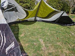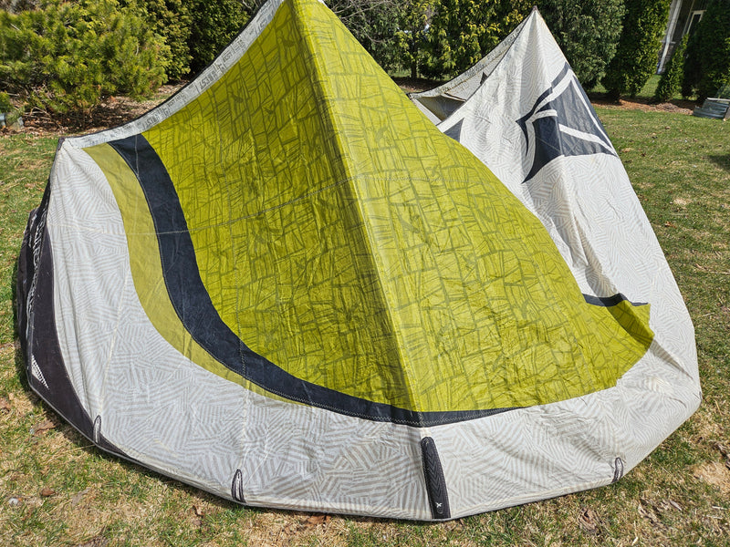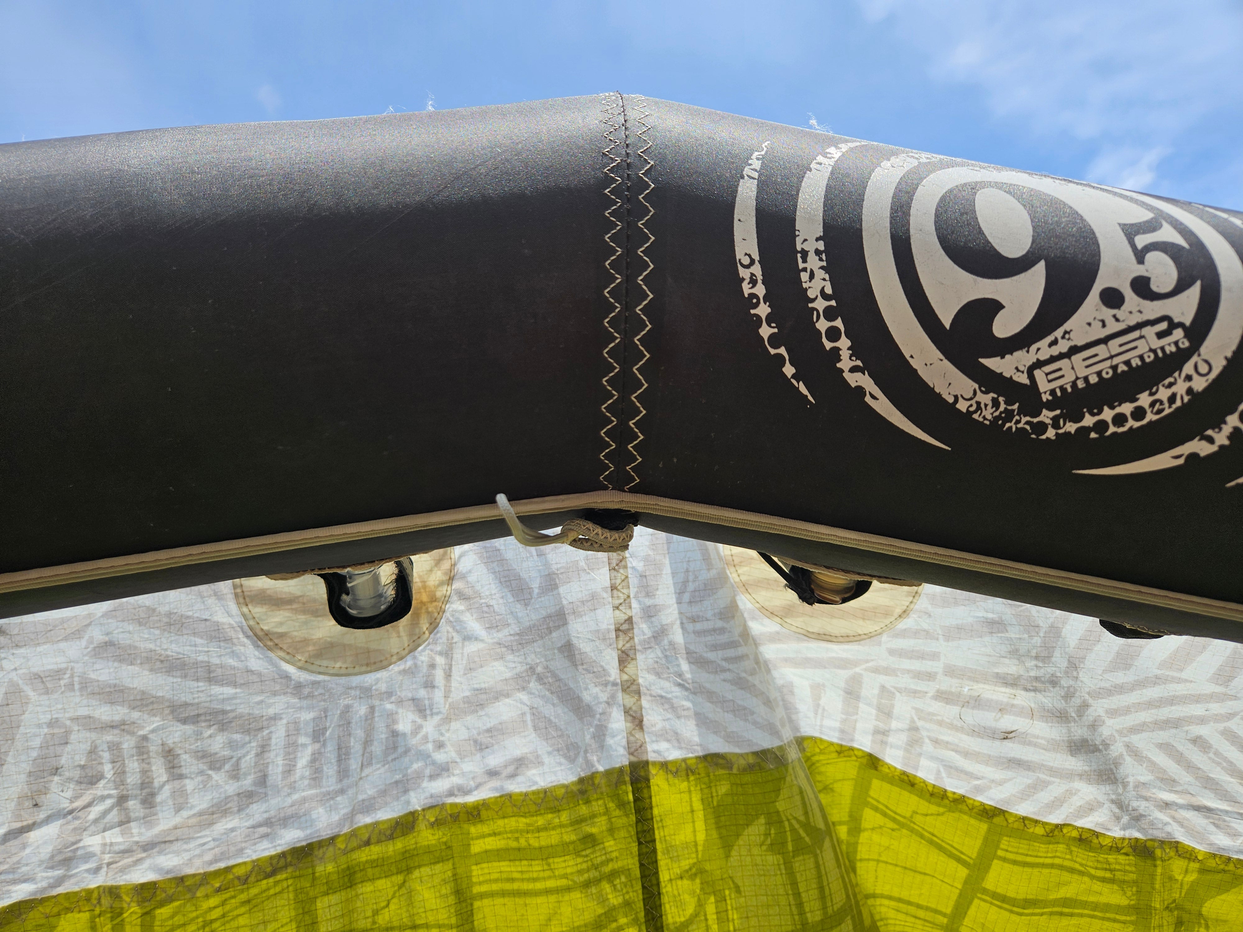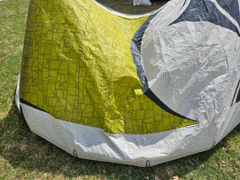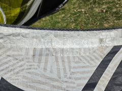 Used Best Kahoona 9.5m Kite. Holds air 100%. The canopy is getting thin from the UV rays so I don't think this kite can take a lot of abuse without a tear to the canopy. There are a couple of small patches to the trailing edge seem you can see in the pictures. Plus, there is some staining. We took this on a trade-in, so we don't know the history of this kite. Also comes with a generic kite bag.