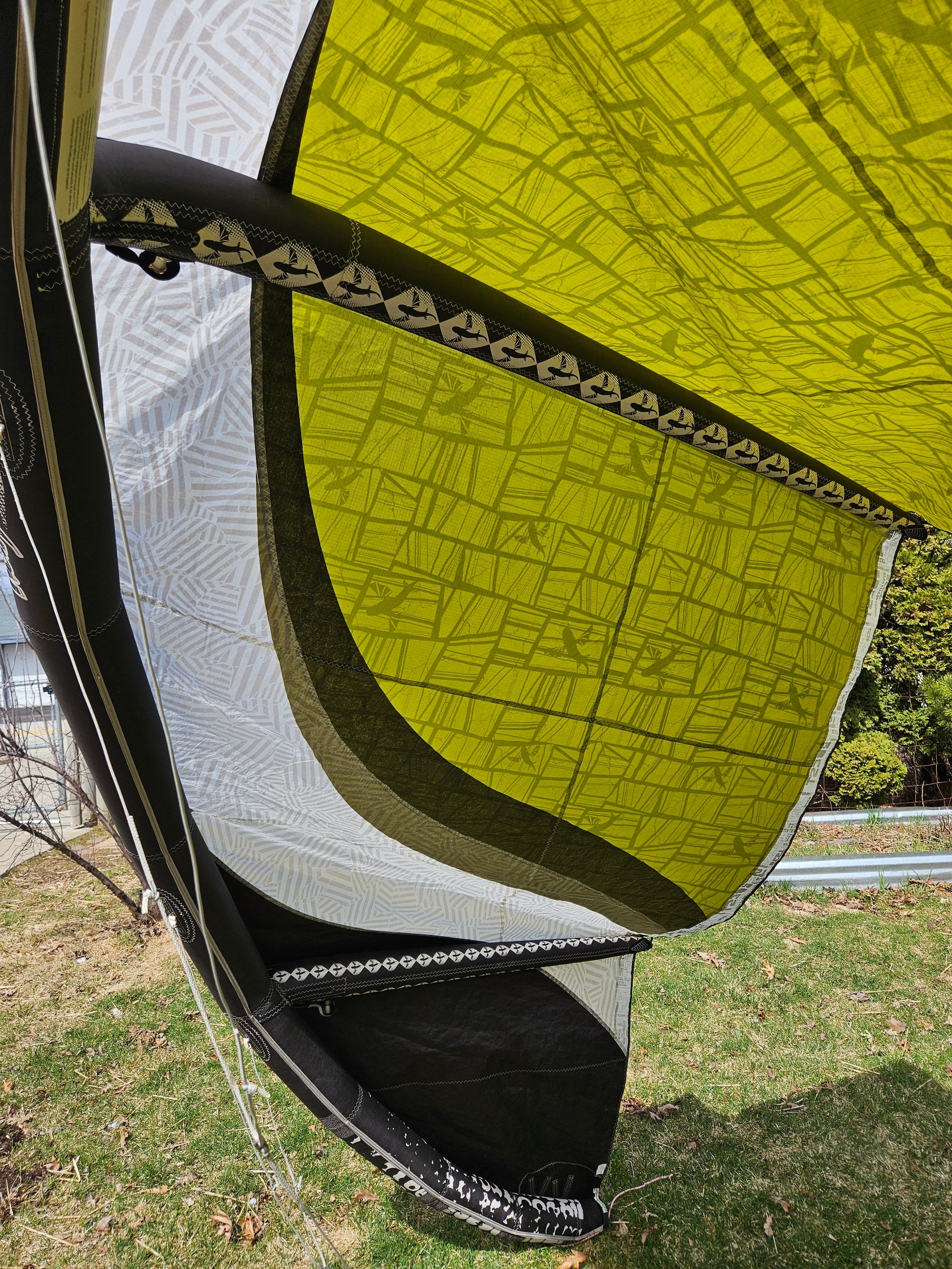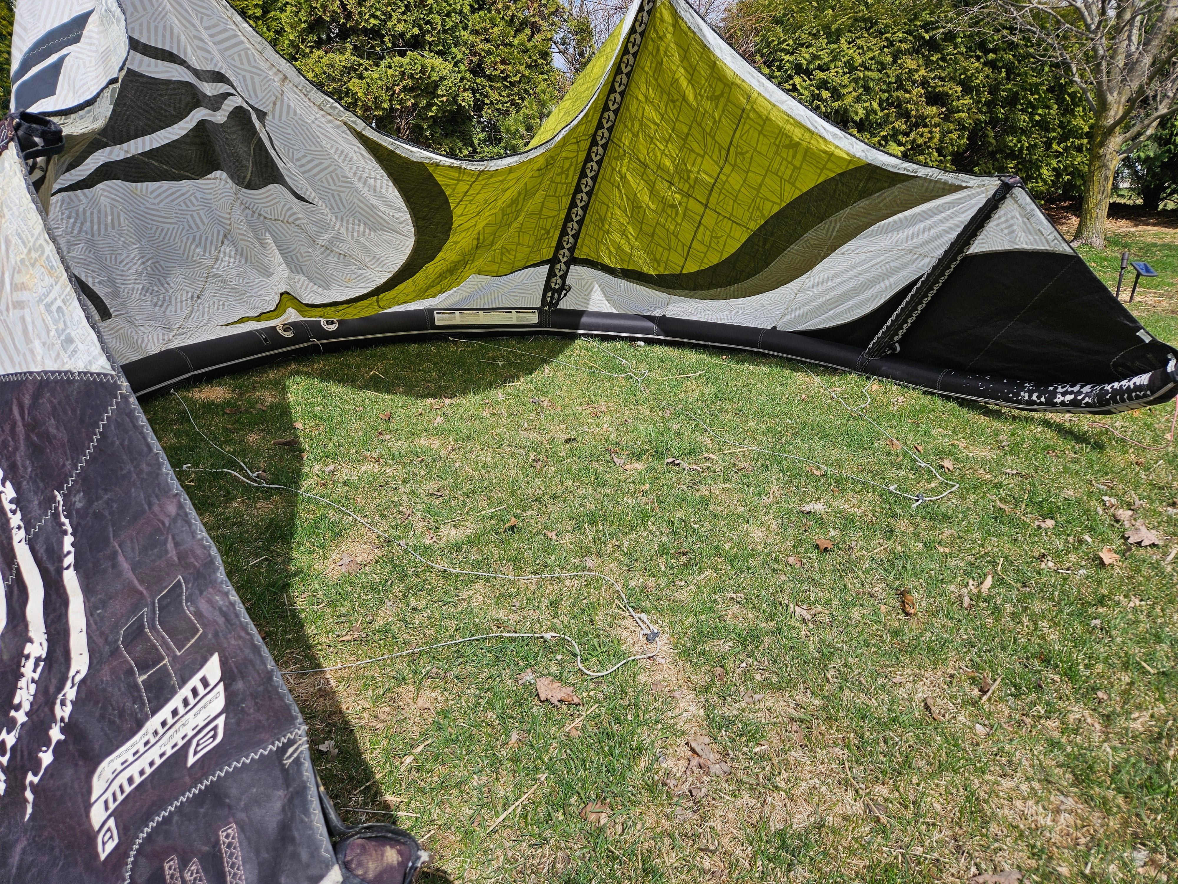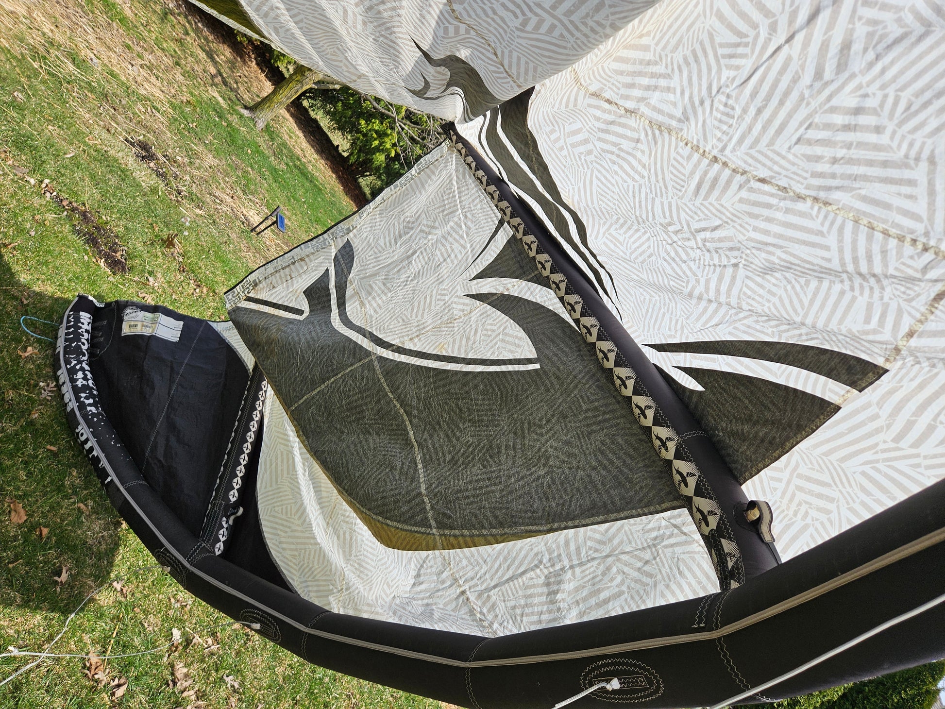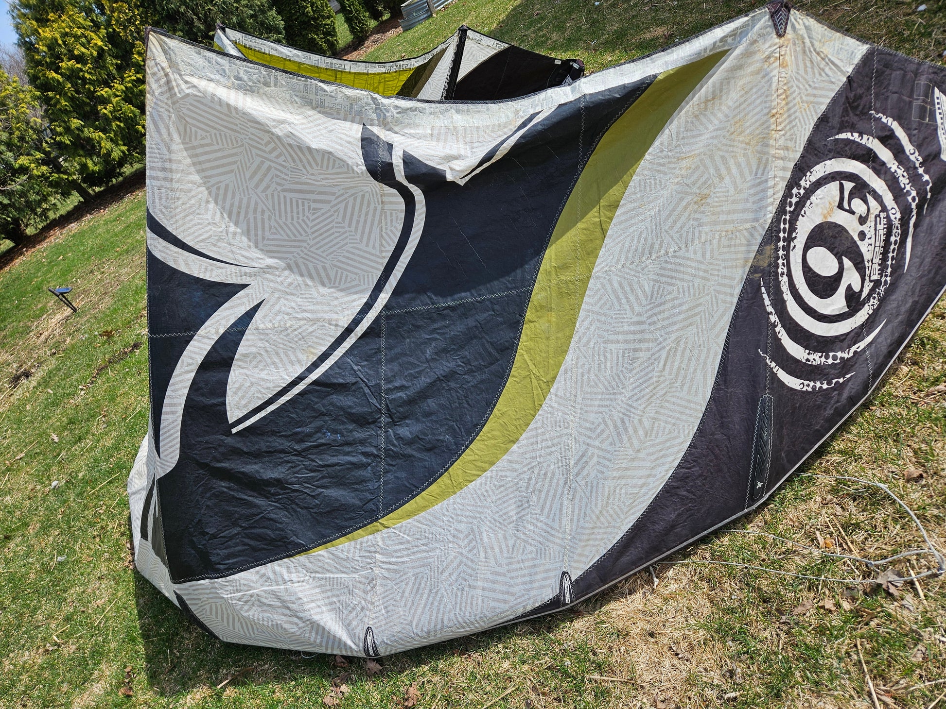 Used Best Kahoona 9.5m Kite. Holds air 100%. The canopy is getting thin from the UV rays so I don't think this kite can take a lot of abuse without a tear to the canopy. There are a couple of small patches to the trailing edge seem you can see in the pictures. Plus, there is some staining. We took this on a trade-in, so we don't know the history of this kite. Also comes with a generic kite bag.
